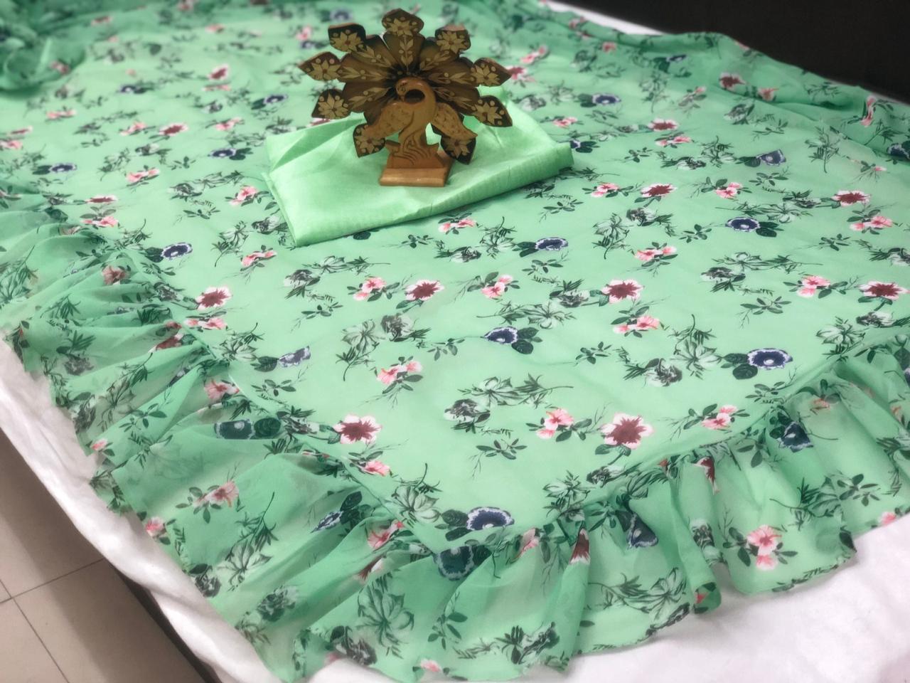 Looking for this same colour beautiful ERICA FERNANDES Digital Printed Ruffle Saree on premium georgette fabric and banglori silk blouse.
