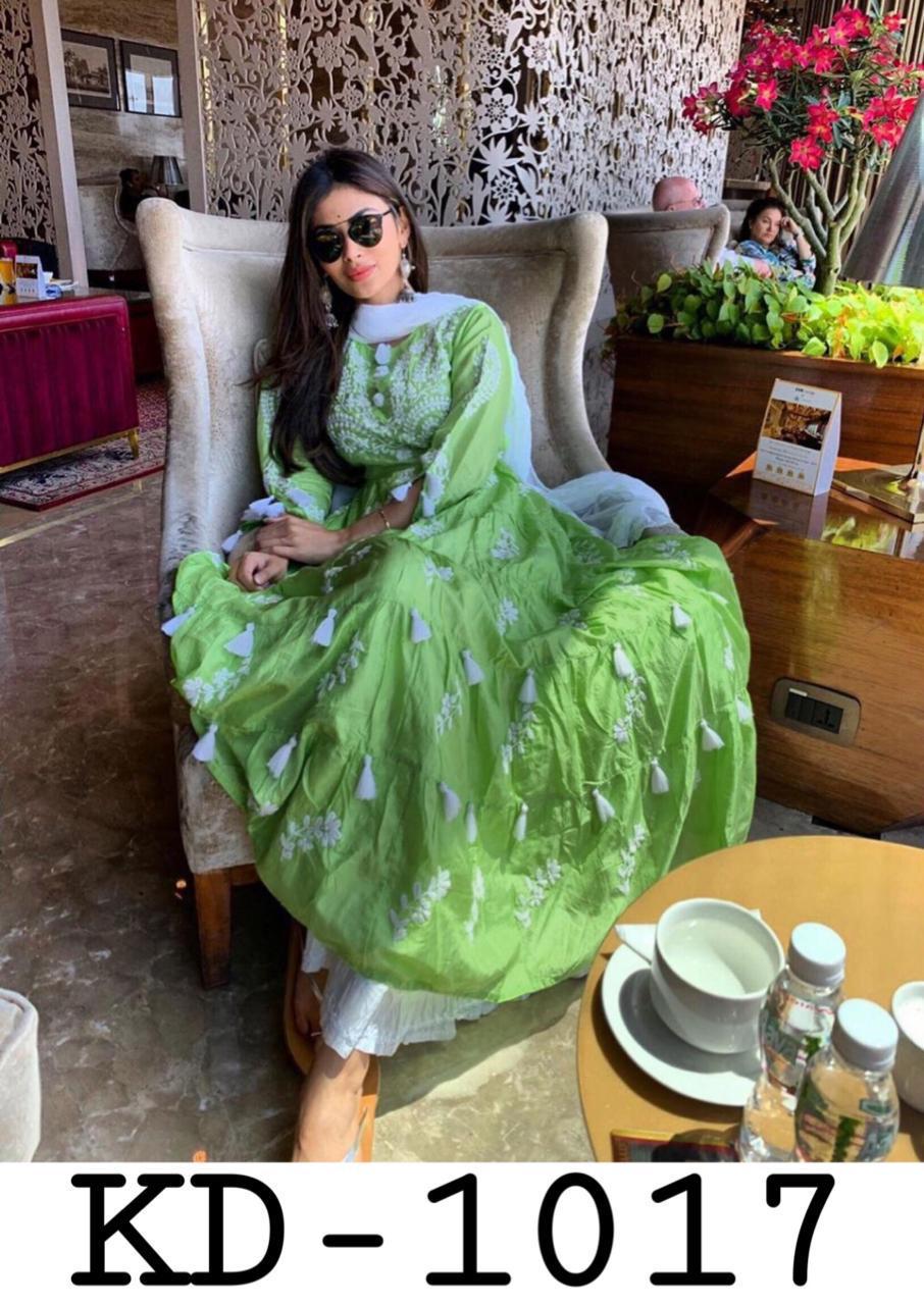 Looking for this same colour Designer *Mouni Roy * Suit with chain stich work on American silk Febric and Plazoo.